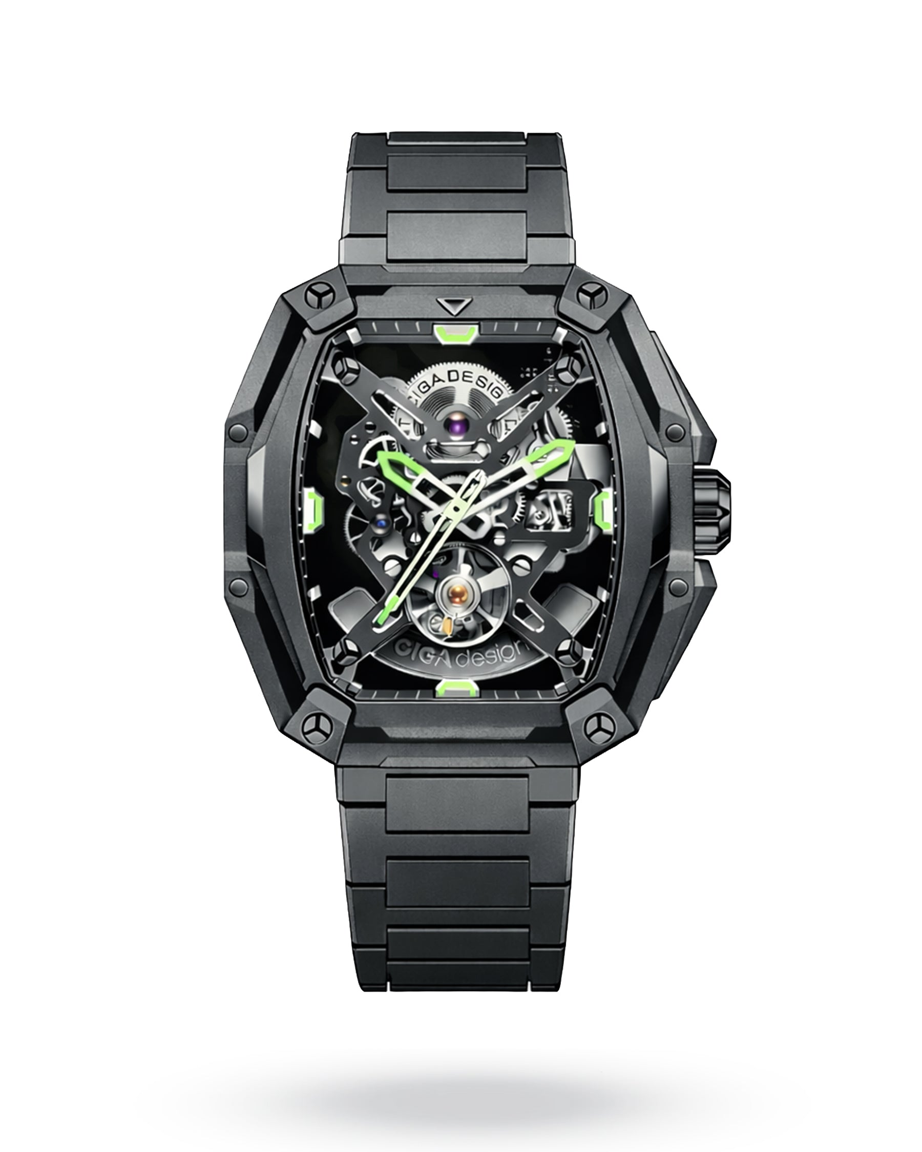 A bold and architectural mechanical watch that blends modern skeletonised design with an adventurous spirit. The CIGA Design Hunter showcases its in-house movement through a fully open dial and back, revealing gears and bridges in full mechanical detail. Its rugged tonneau-shaped case and luminous markers strike a balance between contemporary style and technical fascination.
