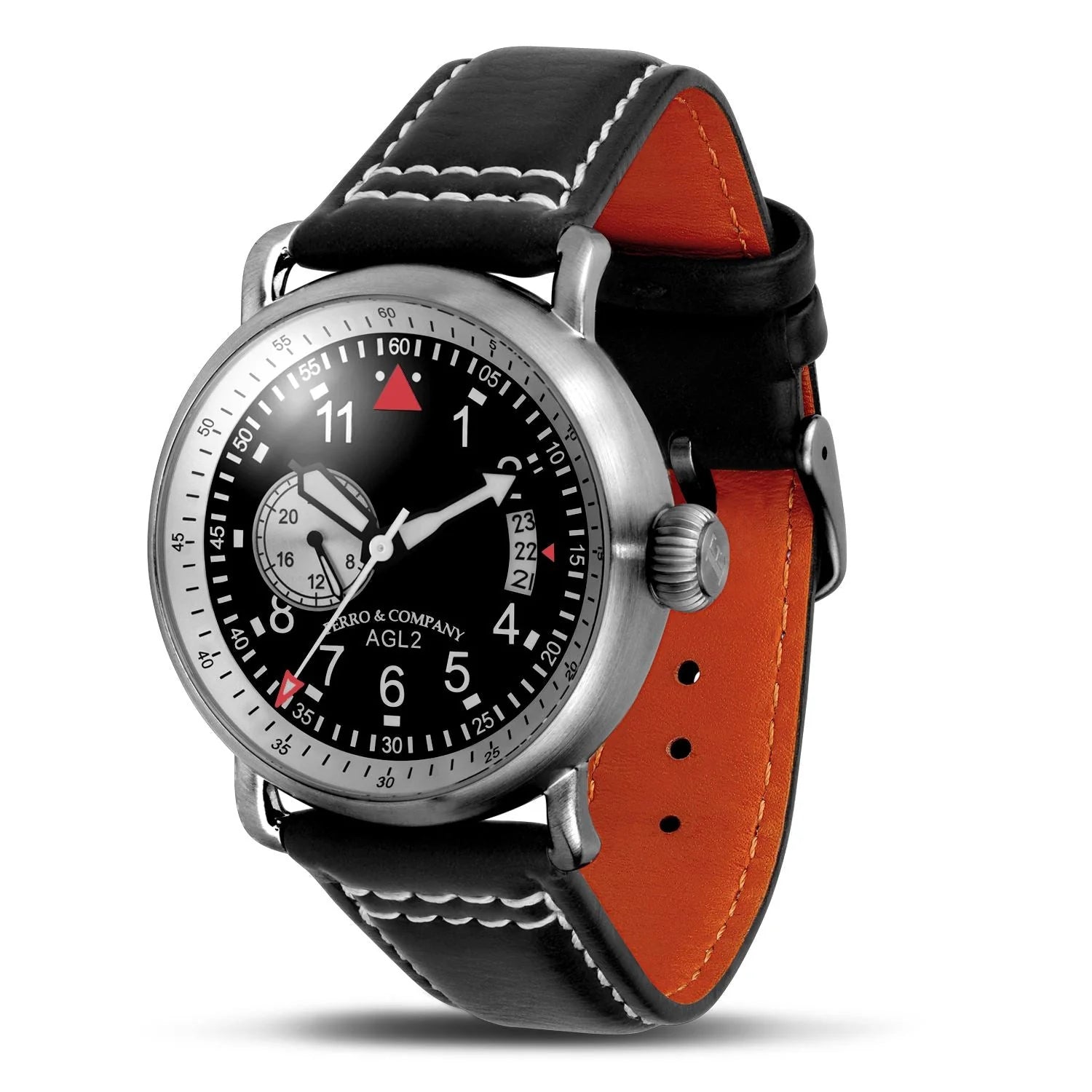 The AGL 2 is a vintage-inspired pilot watch crafted from brushed stainless steel and powered by the reliable Miyota 8217 automatic movement. With a double-domed sapphire crystal, 24-hour subdial, curved date window, and fine Italian leather strap, it blends classic WWII aviation aesthetics with modern durability and precision.